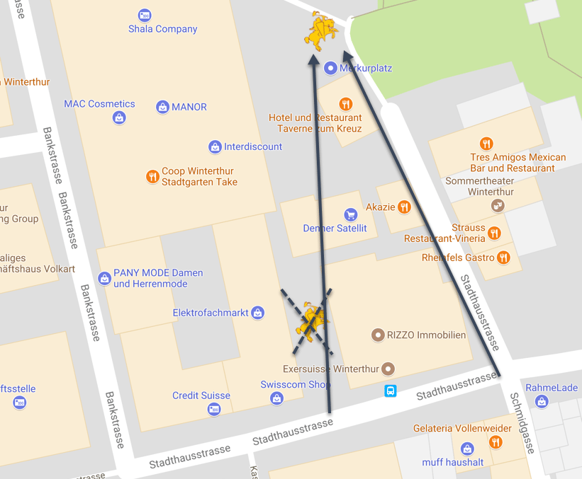 - Vom Bahnhof her kommend: Beim Swisscom Shop links abbiegen, über den leeren Platz gehen und den alten Zeiten nachtrauern, am Denner vorbei in Richtung Manor und schon seht ihr unser neues Zelt.